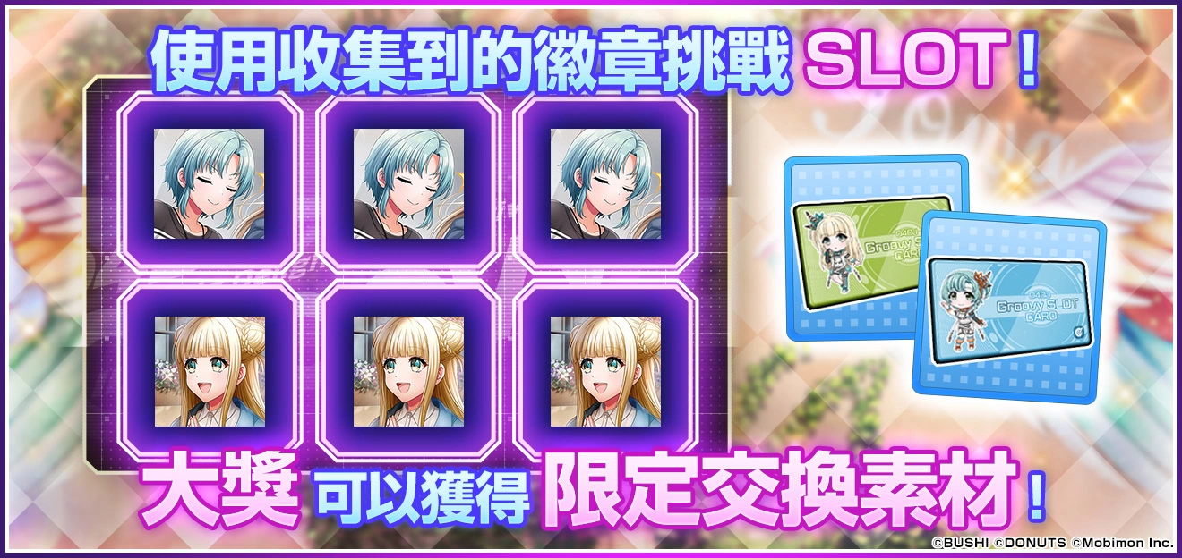 为纪念全新的 SLOT 活动开催,活动期间内登入游戏每天都可获得「SLOT徽章」!每消耗 300 个,即可进行一次拉霸抽奖。登入第 3 天,还可获得活动限定稀有贴图!