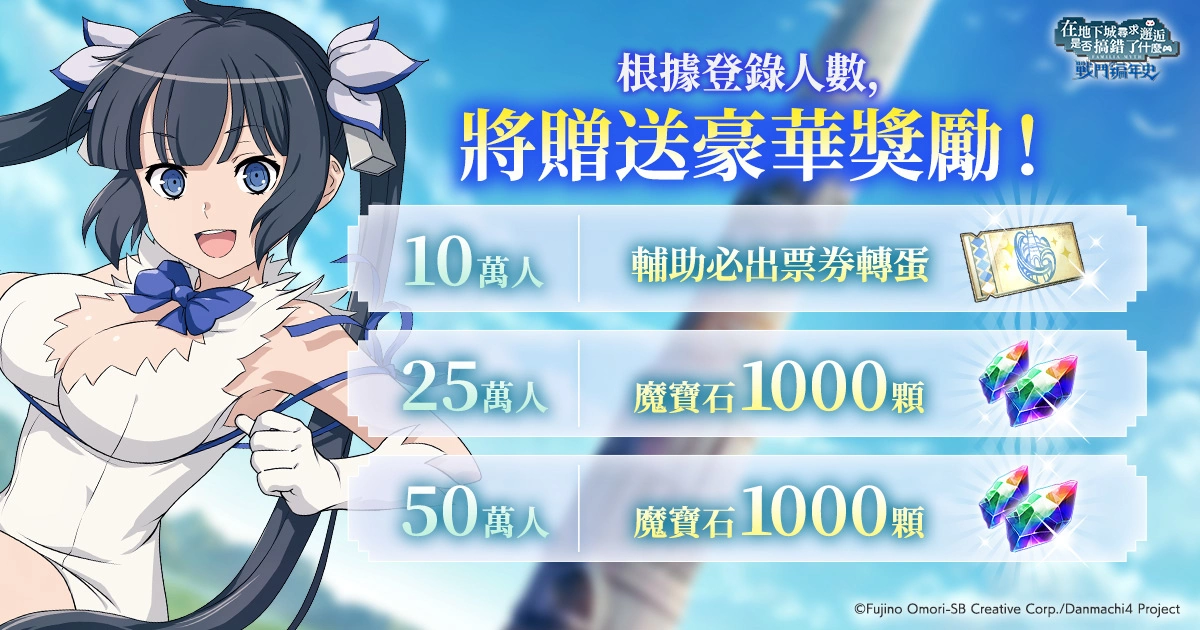 在今日开跑的事前登录活动中,将根据登录人数在游戏上线时赠送所有玩家豪华奖励,包括「辅助必出转蛋卷」与魔宝石等等,喜欢《在地下城寻求邂逅是否搞错了什幺》系列的粉丝与玩家们赶快去参加事前活动吧!
