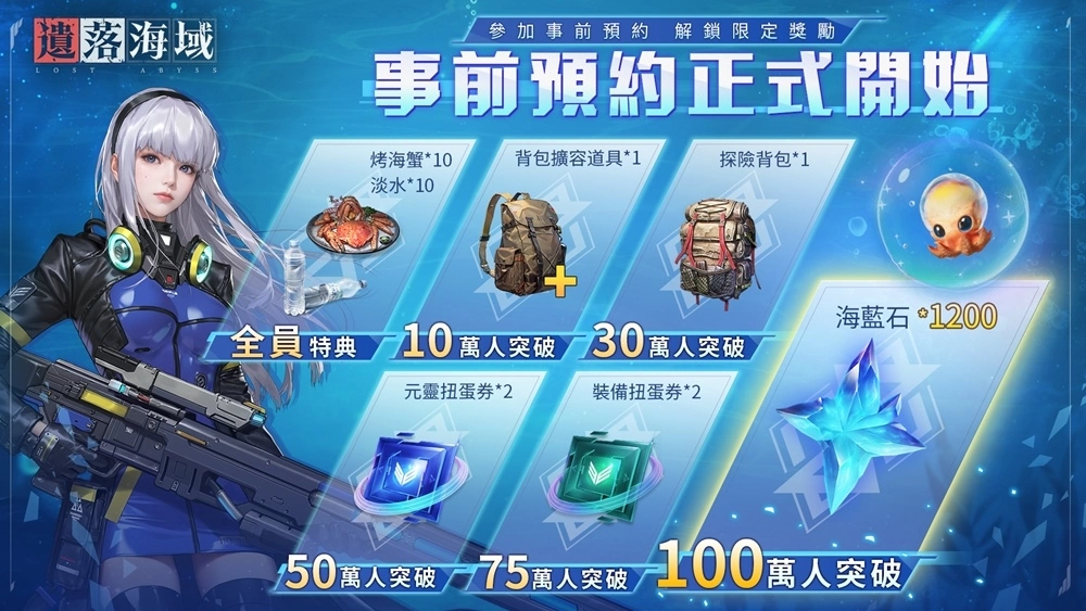 《遗落海域》现已开启事前预约活动,玩家可透过活动网页与App Store参与事前预约 (Google Play预计于5月1日开放预约)。参与预约即可在游戏上线时获得探险背包、扭蛋券、海蓝石等生存资源,预约注册玩家数量越多,奖励将会越丰富!