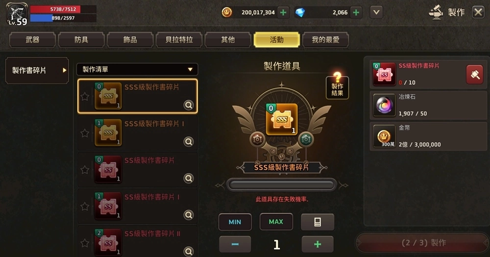 【製作书碎片活动】:于活动期间内,消耗SS级製作书碎片、金币与冶炼石製作「SSS级製作书碎片」,将有一定机率可成功製作出加倍的「SSS级製作书碎片」。