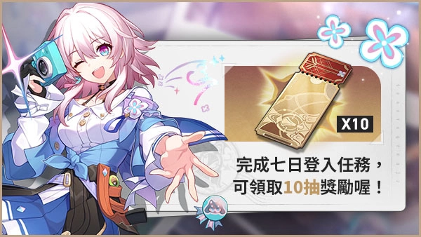 「遨游天外」:活动期间,累计登入7日共可领取星轨专票*10。