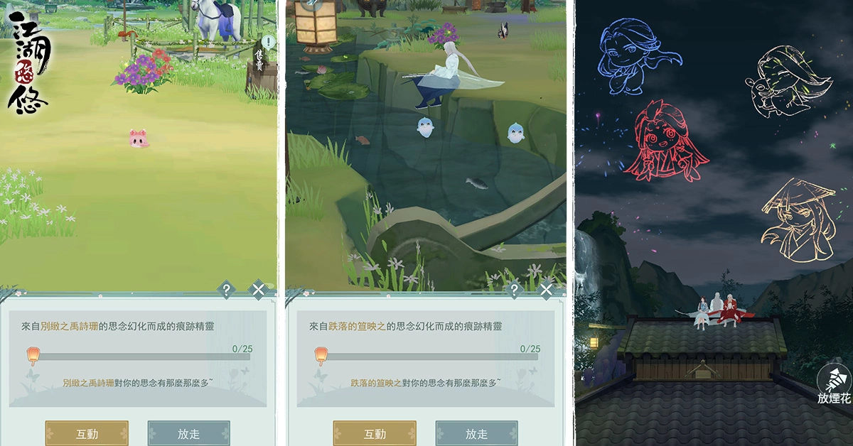全新庭院拜访功能将打造一个更紧密的江湖,玩家们可前往好友庭院做饭、阅读、游泳或钓鱼,若好友恰巧在家,还能开启访客跟随,一起打坐、喝酒、武剑和施展轻功,展现两人的无间默契;倘若好友外出,访客也可以通过「留迹」功能,随机留下小幽灵等印记,将思念化作痕迹精灵等待好友回家。