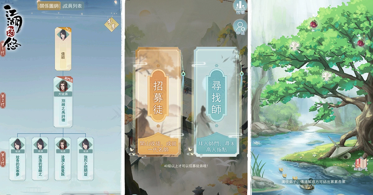 半週年版本同步推出「师门」玩法,等级满8级的少侠将可解锁师门系统,拜人为师,加入师门;而满 40 等的少侠则可以解锁收徒功能,广收徒弟,成立 200 人的大型门派。成为师父后将可探究「为师之道」,且随着逐步完成「师道成就任务」领取对应奖励,还能种植师门独有杏树,使其开花结果!