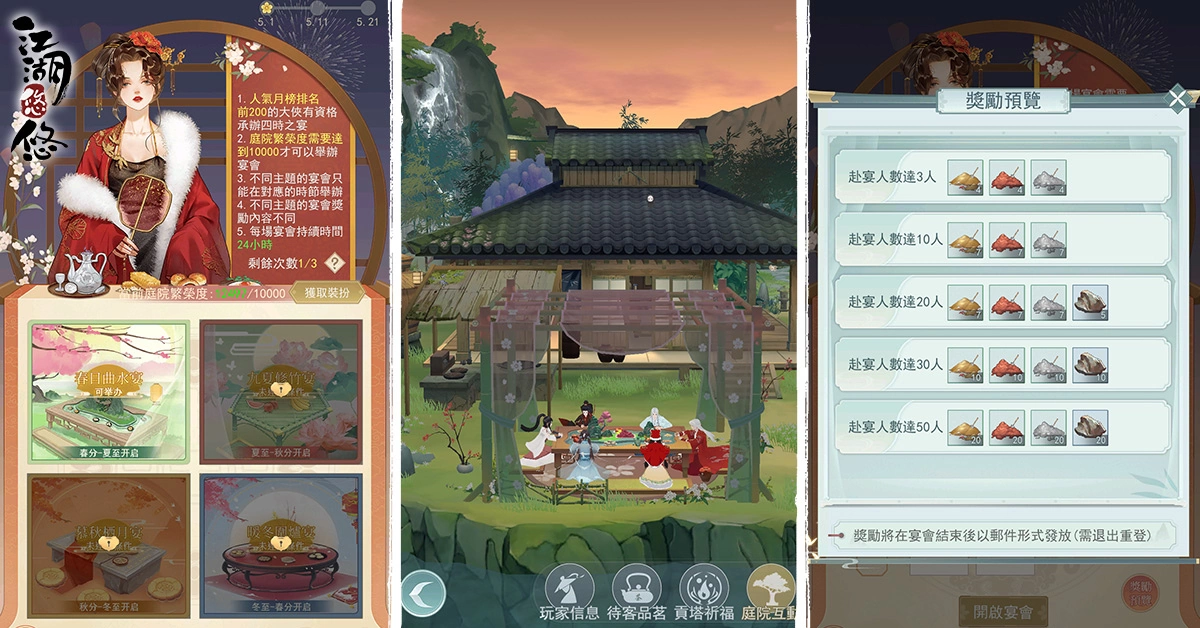 本次更新了「四时之宴」的特殊社交玩法,只要登上人气月榜排名前 200名且达指定庭院繁荣值的超人气玩家,就可以在自家庭院举办「四时之宴」!将能根据游戏里时间和季节的不同,举办四种主题的宴会,让玩家可以大张宴席、广邀好友,并依据赴宴人数获得相应的丰厚结算奖励,参与赴宴的玩家们也能够获得不同主题的宴会奖励!