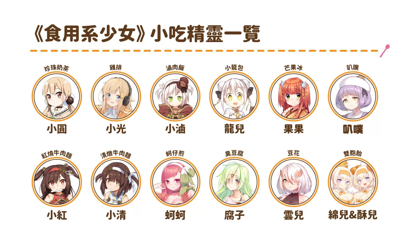 《食用系少女》游戏于 2018 年推出,并于隔年发行续作《食用系少女2:美食内战》。之后陆续推出角色漫画故事,并与女僕咖啡厅、捐血中心、手机游戏等不同领域单位合作推出活动,推广台湾美食,同时也让这些可爱的小吃精灵们发光发热!