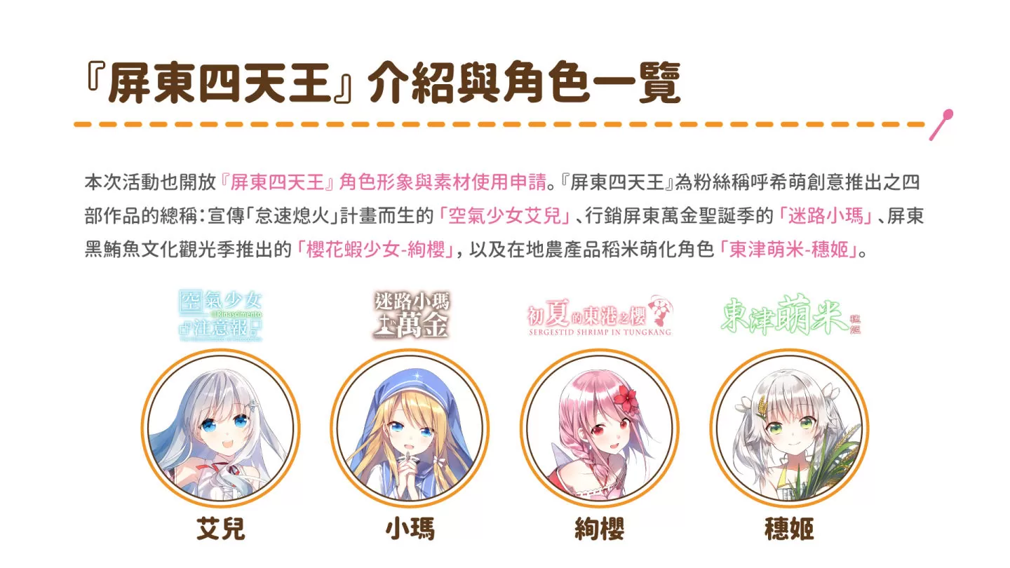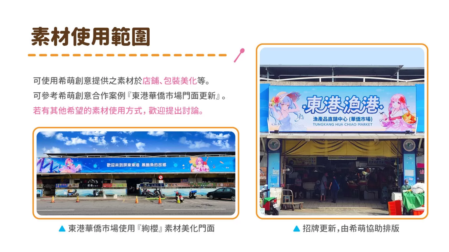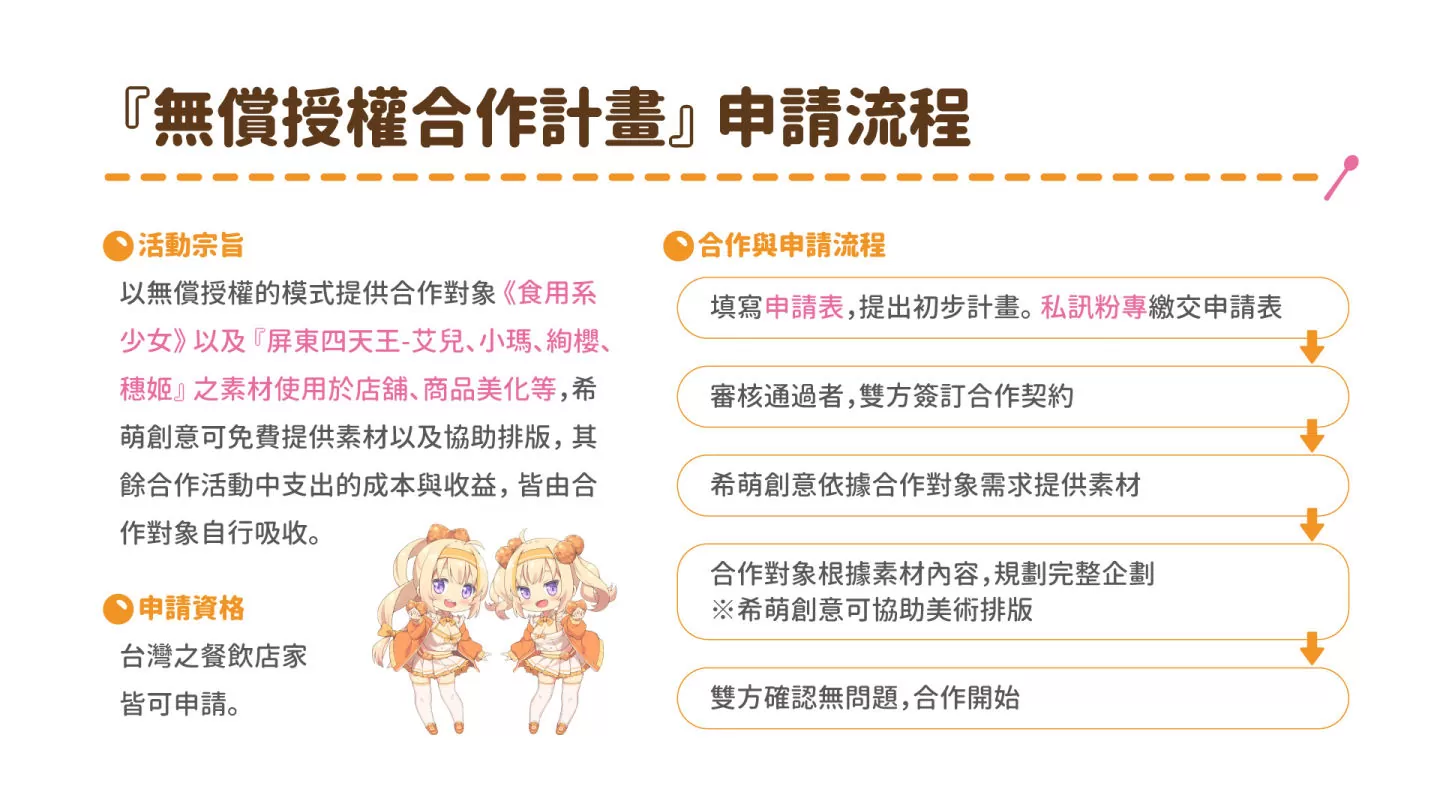 合作方式:可使用食用系少女 / 屏东四天王素材,进行店铺美化等。若有其他希望的使用形式,也欢迎提出讨论。