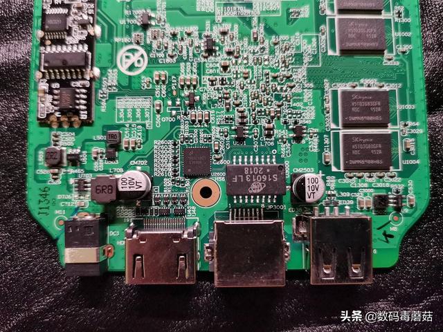 CPU左侧正4反4一共8个的颗粒是内存,型号H5TQ4G83CFR,单颗容量DDR3 512M,合计为4G——注意这里并不是我写错了,官方给出的盒子配置是3G 32G,为什么出现这种情况呢?因为RK3368这颗CPU只支持单通道32bit内存控制器,所以只能用3G内存。