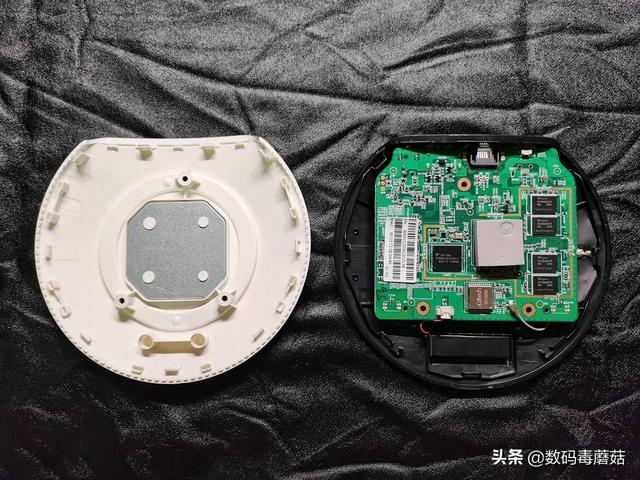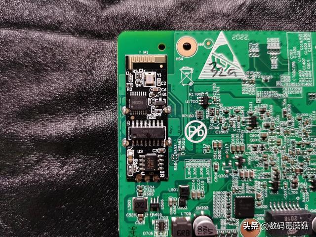 底下带银色马甲的小芯片为高通QC9377双频WiFi,提供最高433Mbps的传输速率,同时这颗芯片也集成了蓝牙功能;旁边的插针座有LED字样,这个是上盖板LED灯供电用的。细心的朋友们可能会发现在板子角落有不少空焊位。目测应该是和其他型号共用的板子,预留视频和语音功能?