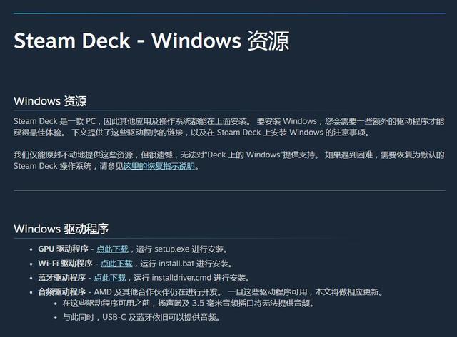 虽然说可以安装Windows 10系统,但是目前还缺少音频驱动。如果现在玩家安装了Windows 10驱动与系统,Steam Deck的扬声器与耳机接口将无法使用,但是通过蓝牙与USB-C接口输出音频。同时Valve无法提供除驱动程序之外Steam Deck上的Windows系统的支持。除了双启动问题,Valve目前也在研究Windows 11的驱动问题。Valve目前正刚开始支持Steam Deck的Windows安装,还有很多问题,还是建议大家等一等,在真正的双启动推出后再进行尝试。