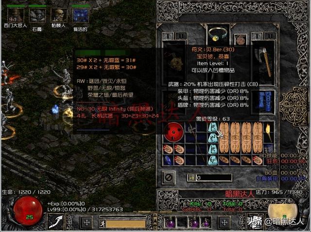 当底材和符文都集齐后,就可以着手制作“无限”了,制作大件符文之语一定要认真核对符文和底材的孔数,建议先把符文按照顺序摆放好,依次为:30号 23号 30号 24号,安装了地图插件的玩家需要先按一下键盘上的insert键打开镶嵌保护。佣兵装备“无限”除了能提供“信念”灵气还能使佣兵有一定的输出能力,最高325%增强伤害和40%压碎性打击(CB)在面对非物免怪输出也不弱,不过最高-55%被动降低敌人电抗对角色并没有效果,这个变量可以不在乎(强迫症和完美主义者除外)。
