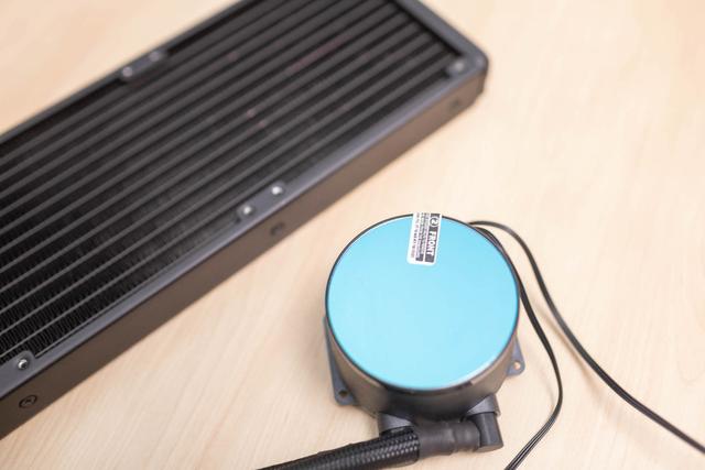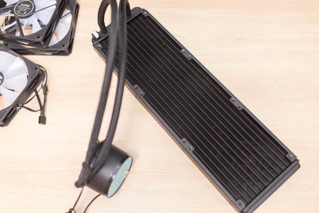 冷排纯铝黑化处理,长度为394mm,宽度为120mm,厚度为27mm,采用了密集波状鳍片,散热面积更大,水管长度约为39cm,采用尼龙编织材质。