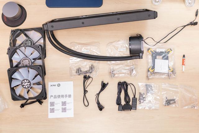 配件方面包含了一体水冷,3个ARGB风扇,全平台支架,螺丝,数据线和RGB控制器,硅脂,说明书等。