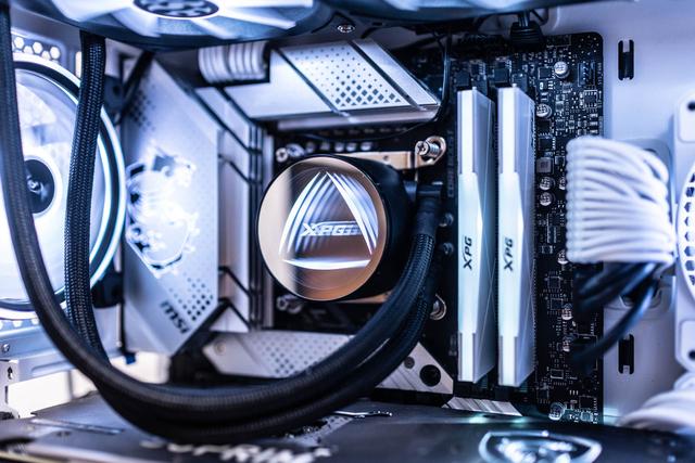CPU散热和机箱风扇均升级XPG炫彩系列,CPU散热是XPG的霜盾炫彩360一体水冷,包装上面,散热器和风扇均采用了XPG红色的家族配色。这款360水冷拥有一个炫酷的几何形镜像LED水冷头,配置性能级ARGB散热风扇,兼容INTEL和AMD双平台,从官方参数看可以压制I9和R9处理器。