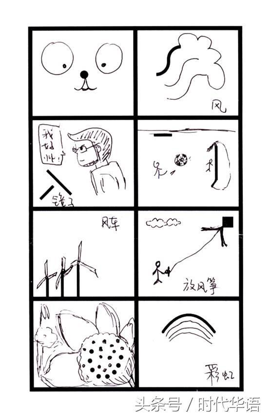 请分别在以下每个格子里作画,其中空白格子可以画任意你想画的图案,给出线条的,请在线条的基础上完成画作,画作的解析请见后文。还请大家不要在画好之前看解析哦!另外,在本文的末尾,还分享了超有才的小伙伴们的画作,并附上了有趣的解读,请在完成你的画作之后再看。