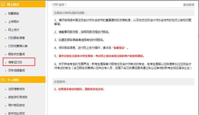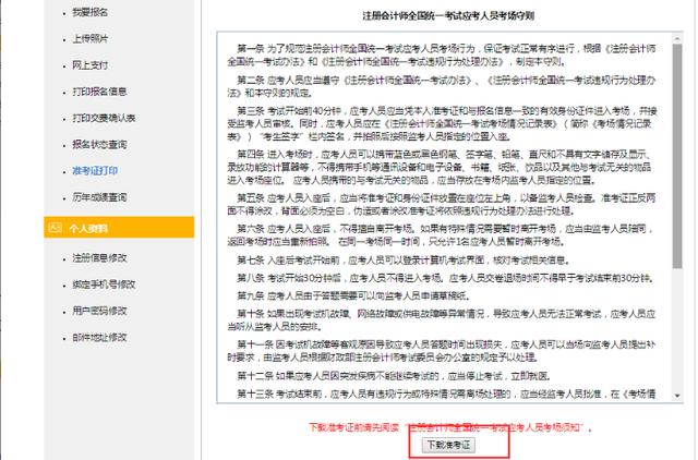 注册会计师准考证下载流程介绍第一步:阅读协会发布的通知和公告包括重要通知、政策制度、地方公告、问题解答。第二步:考生登录网上报名系统使用网上报名时的姓名、身份证件号码及密码登录系统。第三步:下载准考证登录成功后,点击”打印准考证“进入下载准考证流程向导,阅读考场守则并下载准考证。第四步:进行注册会计师准考证打印。