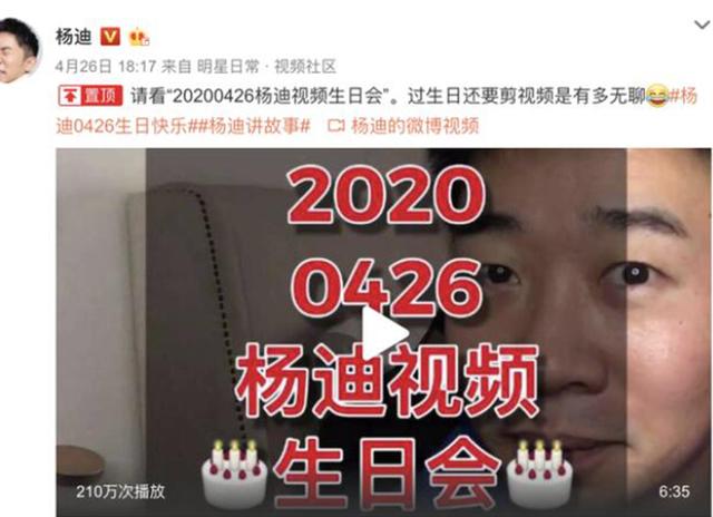 4月26日是杨迪的生日,圈中好友都纷纷送上祝福。晚间,杨迪上传了自己剪辑的视频庆生,并逗趣写道:“请看‘20200426杨迪视频生日会’。过生日还要剪视频是有多无聊。” 他现场点名了跑路站姐,原因是自己翻看粉丝为自己创立的4个站子时,发现其中3个站子已经停止运营一年。有一位站姐还写道:“我不会着急,也不会离开!”而杨迪则回复道:“你离开了,你已经离开一年多了!”