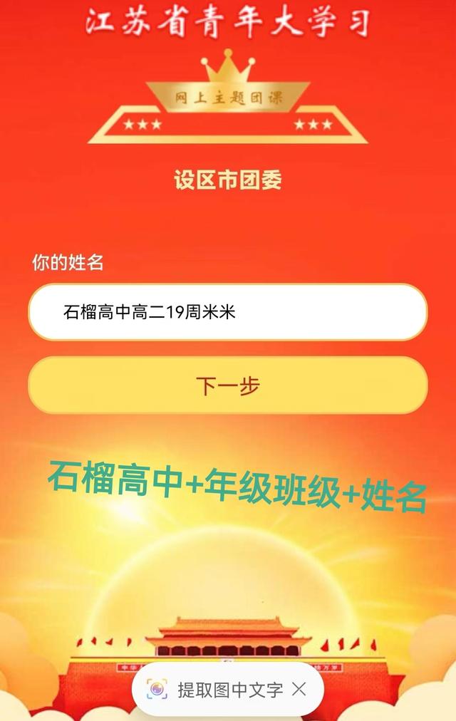 3. 在“你的姓名”中输入“石榴高中年级班级姓名”。例如:“石榴高中高二19周米米,否则后台统计不到。点击“下一步”。