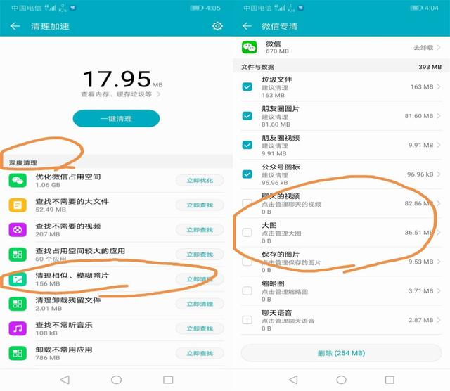 2.再来清理一下缓存吧,手机管家>清理加速>一键清理,也可以进行深度清理,深度清理的使用需要注意谨慎清理,清理微信的时候,如聊天的视频、大图、保存的图片等等,总之是系统默认没有勾选带图片和视频的描述,在清理的时候需要自己进行筛选看那些图片和视频还需要,不要点击全部不然有可能删掉您需要的资料。还需要强调的就是清理相似、模糊的照片,千万不要点击全部,需要小伙伴一一筛选删除,不然手机上所有的美美的照片都会被删掉。