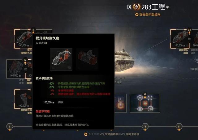 在配件方面,车长们可以选择改进型通风系统/结构调整/高级光学观察镜/垂直稳定器等配件以提升283工程的作战效率,也可以考虑安装涡轮增压器提升它的机动性表现或是安装改进耐久提升它的生命值,强化它的近战属性。在战地升级方面,达到VI级后283工程可以获得额外的3%发动机功率与1%的生命值,同时可以选择4项性能改装与1项配件加成栏位选择。3项性能改装玩家可以选择提升模块耐久度、强化瞄准镜、涡轮增压器调整和高级耐久加强。在经过上述改装后,283工程会更加适合近距离战斗。
