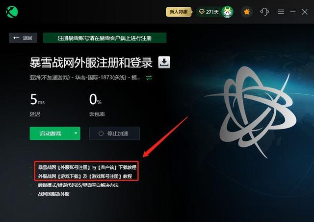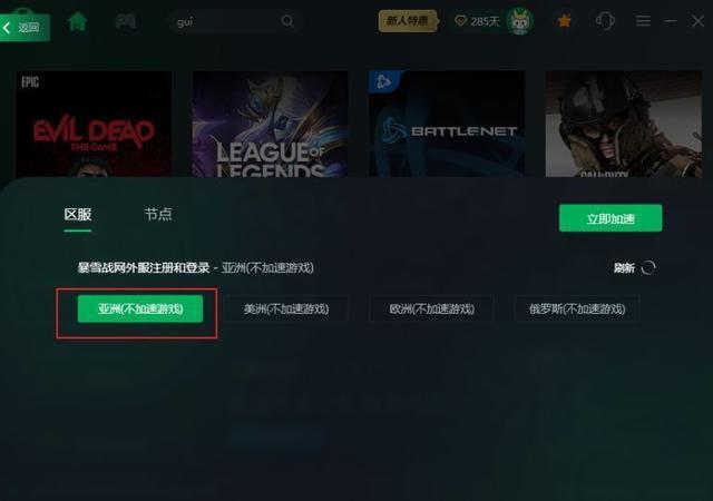 3. 注册账号:点击“建立免费的暴雪账号”,建议选择【亚洲】区服,点击【立即加速】;
