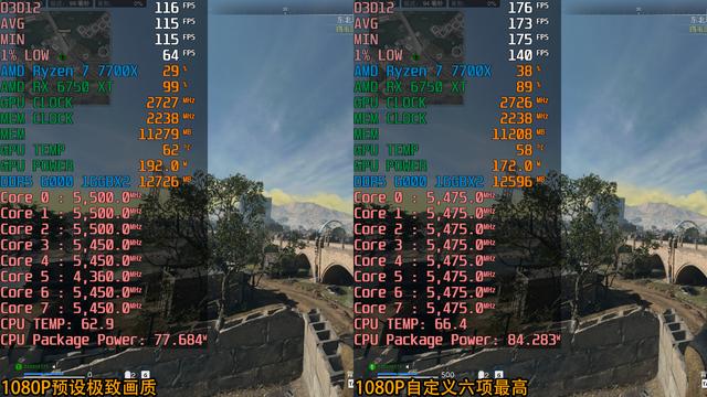 Ryzen 7 7700X RX 6750 XT在1080P分辨率中两种画质下的静态硬件OSD信息