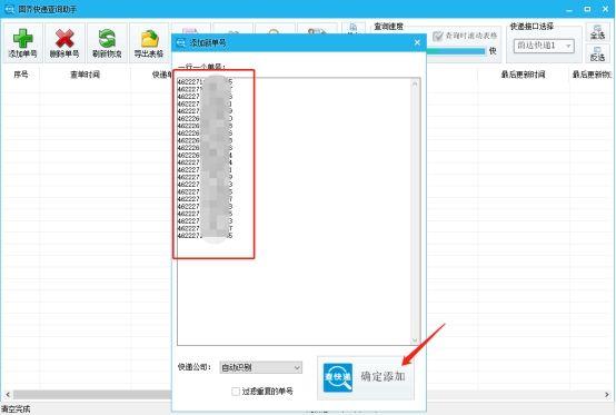 4、点击添加单号就可以将单号批量的添加进去,记得要以一行一个单号的格式进行添加,不要有空格,完成后就可以点击确定添加了。