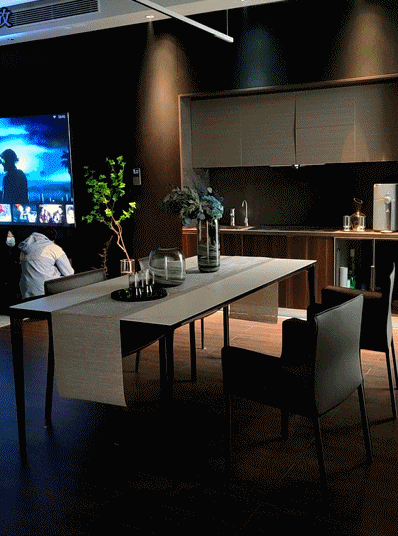 打开家门后,欧瑞博开启下班模式,无主灯温暖的光芒洒满地上,房子里回响着自己最喜欢的音乐。