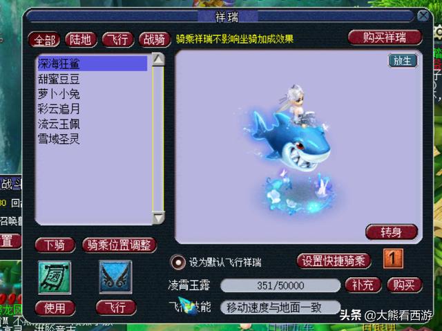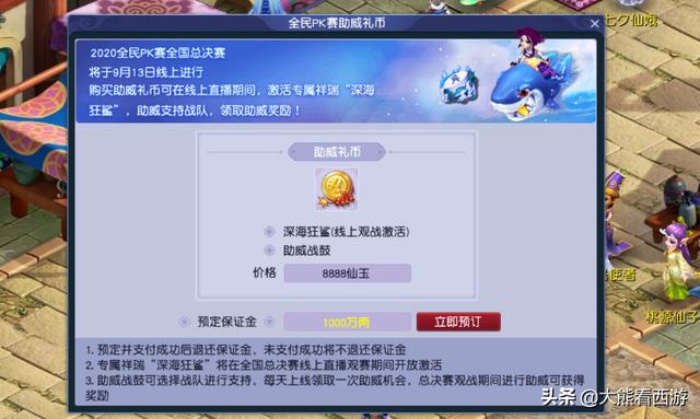 除了激烈的比赛以外,最让玩家们心心念念的深海狂鲨限量祥瑞这次也会放出。虽然深海狂鲨的定位是“线下活动专属祥瑞”,但由于今年受疫情的影响,全国赛只能在线上举行。因此玩家可以通过购买8888仙玉的“决赛助威礼币”,然后在决赛那天线上观看比赛激活祥瑞。大熊觉得这其实还挺好的,至少能让那些不方便跑大老远看比赛的玩家省下一笔“代领”的费用。