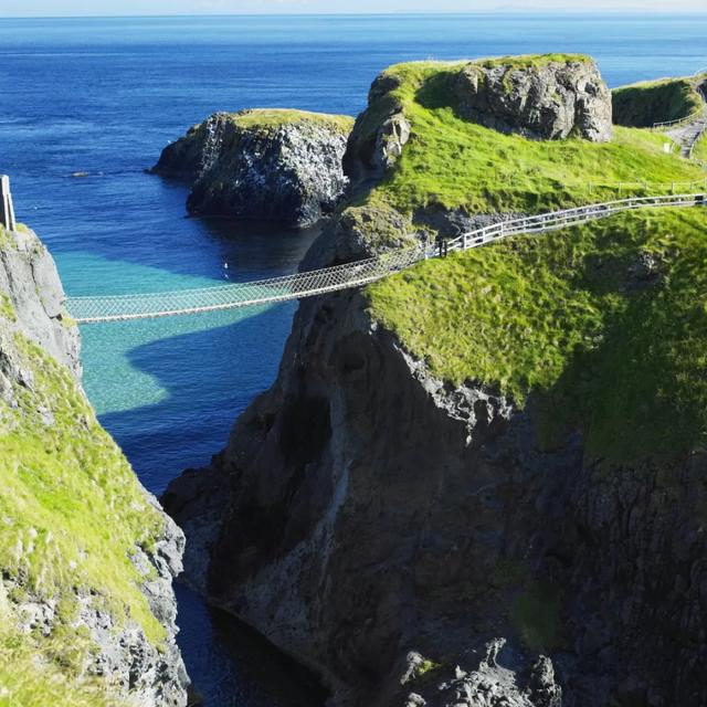 这条宽1米、长20米的桥梁用绳索串连,将海边断崖与卡里克岛连接起来,在遍布岩石暗礁的海水之上30米处迎风摇曳。在桥上走过,惊险又刺激!