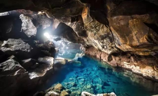 米湖是冰岛第四大湖,四周遍布火山口,温泉和熔岩地层,布满了嶙峋怪石,里面有45°C的地热水,透过裂缝洒下的阳光与打在湛蓝的泉水上,尤其美丽!