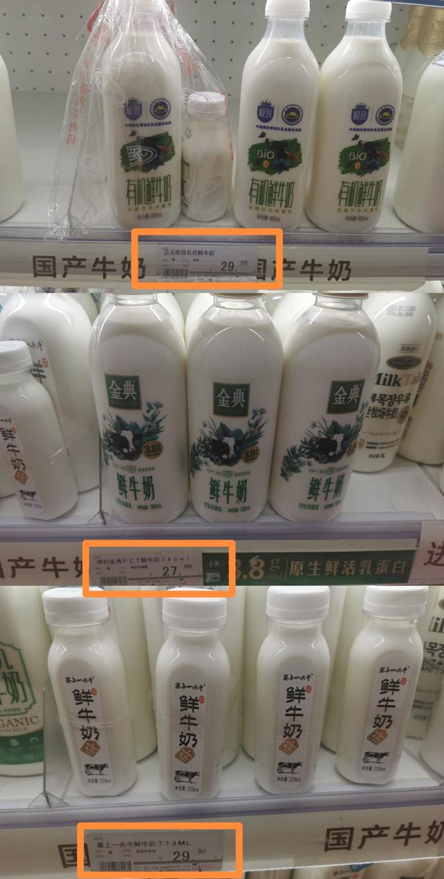 新京报记者近日走访北京某超市发现,伊利、蒙牛、三元、光明、新希望700ml规格以上的鲜奶产品(非超巴产品)单位售价通常在16元-29.9元不等。而售价超过29元的鲜奶产品,通常为A2蛋白、有机或采用了超高蛋白工艺的“高端”产品,部分鲜奶产品还有买赠促销。