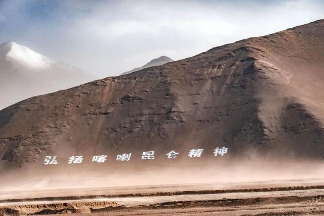 新藏公路旁的山体上刻有巨大的“弘扬喀喇昆仑精神”字体,这精神已经成为中华民族性格的一部分。