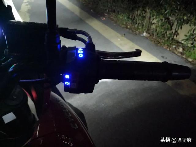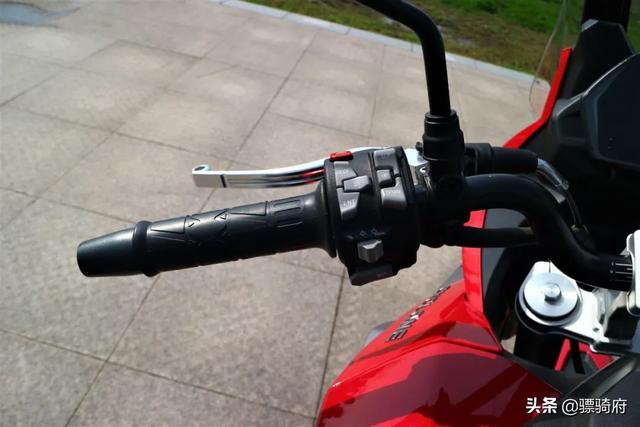 两个手把集成了多个功能键,例如仪表功能选择,风挡调节开关,双闪灯开关,转向灯开关,紧急熄火开关(兼做启动按键),自动大灯开关,喇叭开关(是双音喇叭哦),行车记录仪开关等等。
