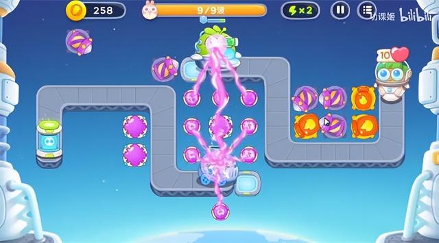 1、开局可以在中间建造几个魔法球,在兔子过来之前的空隙先清理一些建筑障碍,魔法球能够向多个方向进行攻击,玩家能够看到第一波的时候在中间放魔法球,一切小兔子都无法通过,然后可以利用多余的时间在后面放个火瓶炮加快打开地图的速度。