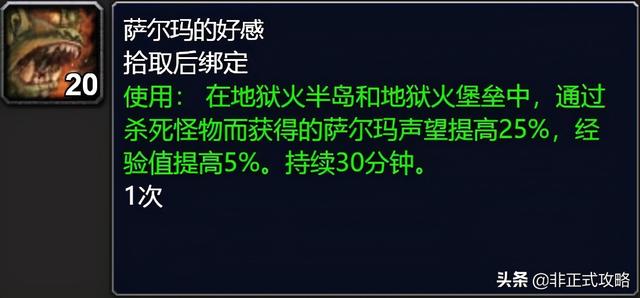 萨尔玛印记:通过做PVP日常任务、地狱火半岛的三个工事塔点击杀对方阵营玩家获得。