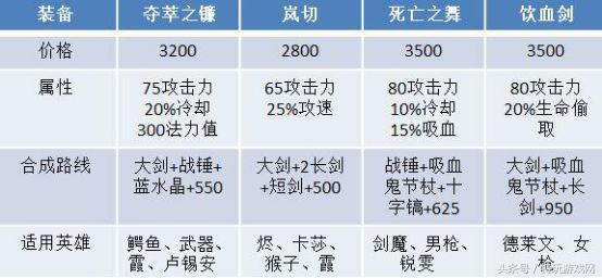 我们对几件属性相对类似的装备做了对比分析,发现岚切和夺萃之镰的售价相对便宜,且合成路线平滑,比较适合第一件选择。综合属性上来说,夺萃之镰的攻击力加成不低,另外冷却缩减效果非常明显,配合特殊效果后非常适合一些上单战士和下路射手。