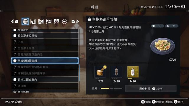 体力与耐力的回复,加上各种正面效果,超高的收益让料理成为了本作中最有价值的消耗道具没有之一