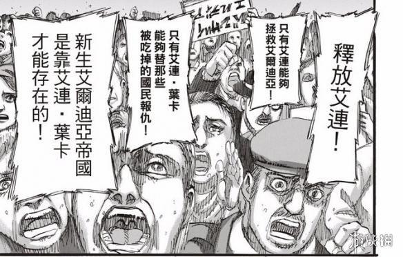 另一边,伊蕾娜对皮克希斯司令承认和艾伦密会过,但是她一直都认为自己的行动就是为了拯救艾尔迪亚,吉克和艾伦两兄弟会让世界脱胎换骨。而韩吉则找到被扣押的马雷人质,他们越来越觉得有些事情已经开始运转了,这个时候在总统府前也聚集了大量的人,要求释放艾伦。