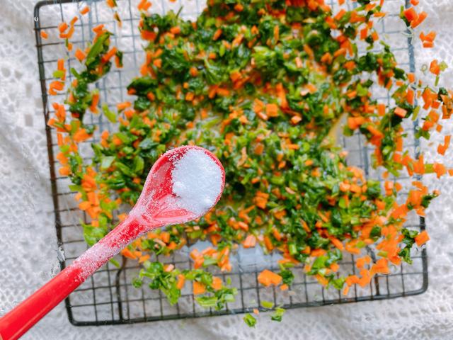 3、豌豆尖过凉之后捞出来挤干水分,然后用刀切碎,胡萝卜切碎放在一边备用;