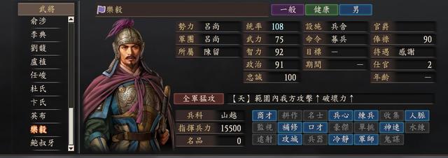 乐毅:战国时期燕昭王的名将,在12中108的统帅使得他成为顶级名将,兵种为山越兵。特技为天属性的全军猛攻。增加范围内我方攻击力和破坏力,使得他成为一个统帅大师,破城高手。92的智力加上91的政治让他出将入相,独当一面。