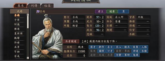 姜子牙(吕尚):乱入游戏中的BUG人物,技能是神属性中的兵者诡道--降低范围内敌军的状态,不管是谁,都能从武二变成武大,守城的神将。自身的状态都很好智力最高小编喜欢用他当主公。