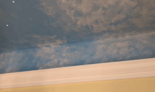 首先你要屋子的房顶位置绘制出白云蓝天的样子,仿佛置身于户外空间,两侧可以加入灯带为夜间造型做准备
