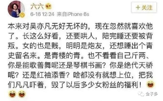 “更有甚者,一些女艺人如马薇薇跪舔吴签,说什么明星X粉是粉丝最好的福利。扬言吴签这是“活菩萨”,把性侵粉丝美化成“亲民之举”。更有女作家大V六六者,一边垂涎粉丝福利,又一边恶毒攻击受害者。真真是丑态百出,三观尽毁。不知带坏了多少年轻人。”