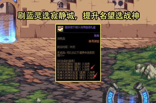其中在玩家最在意的高级地下城门票*6中,包含寂静城和战神本这两种类型,普通~勇士门票都有,对于这2种门票,如果想刷蓝灵上衣自然选寂静城勇士最好,如果想提升名望,自然选战神本勇士最好。