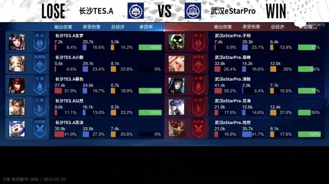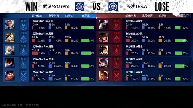 2022年KPL春季赛常规赛第一轮第二周第五个比赛日第二场比赛由武汉eStarPro对阵长沙TES.A,这是一场S组的比赛,武汉eStarPro上一场负于重庆狼队,15连胜被终结,长沙TES.A开赛两连败。最终,武汉eStarPro零封长沙TES.A,武汉eStarPro避免连败的同时送给长沙TES.A三连败。