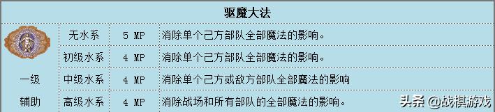 高级水系下的驱魔大法。能驱散一切魔法效果,包括抗魔大法。对战场上的地雷、火墙、流沙、力盾等战场魔法也能够驱散。