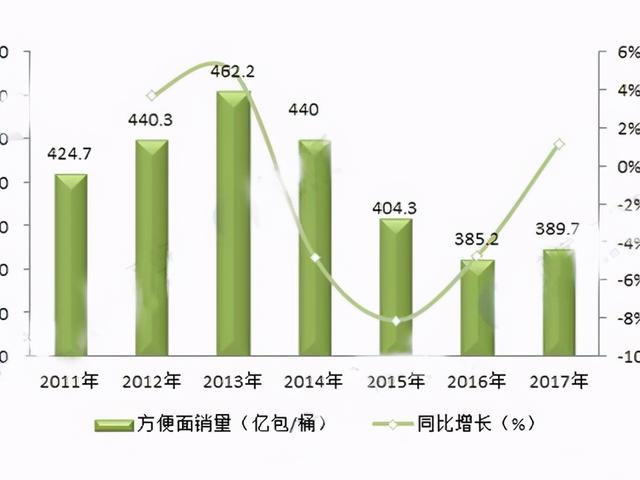 从2013年开始,泡面的销量几乎每年都在下滑,从大陆巅峰时期的462.2亿包,下降到385.2亿包,销量足足下滑了1/6!