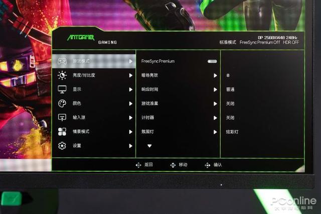 OSD界面则是蚂蚁电竞家族样式,经典的黑绿电竞风格,采用一层多级的菜单样式,十分直观易用。