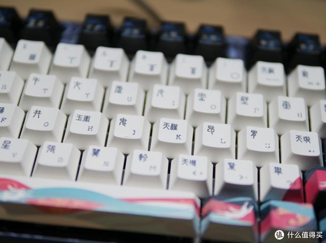 这把键盘大概有20颗键帽使用了五面热升华工艺,空格非常平整,完全没有跷跷板。F区的键帽质感和主键区不一样,是光滑触感,