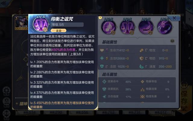 首先个人的看法这张卡人气不高,不能成为热门。可能游戏也是为了原作把天兽、天琴两个宿敌绑在了一起,都是搞音乐的嘛!我们来看看技能,技能一就不介绍了。技能二选择一名敌方,如果对方使用过能量,则判定为邪恶,受到450%的念力单体攻击,敌方使用的能量加到己方,上限为三颗。这个技能看似念攻不错,实际上对方有藤蔓或恢复能力强的斗士,基本上挠痒痒。恢复能量上还是不错的但得合理安排法拉奥的速度,不能太前也不能太后,不然都发挥不出来。